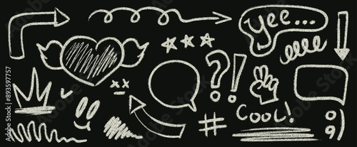 Set of handwritten scribble doodles in chalk for poster, social media. Rough grunge brush texture of a child's or teenager's pencil drawing.