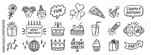 Set of Happy Birthday for kids doodles. Sketch of party decoration, gift box, cake, party hats. Birthday doodle hand drawn icon set.