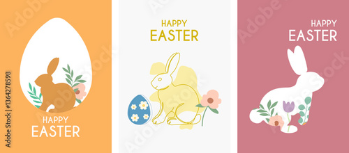 Set of Happy Easter greeting cards with Bunny, Easter eggs and floral decorative elements. Minimalist style. Set of Modern Easter covers. Vector illustration