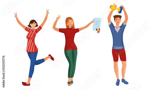 Set of happy young people with the winner cup and diploma. Vector illustration in flat cartoon style.