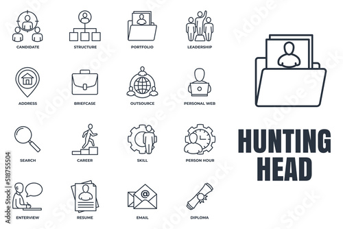 Set of Head Hunting, portfolio, skill, email, person hour and more icon logo vector illustration. recruiting pack symbol template for graphic and web design collection