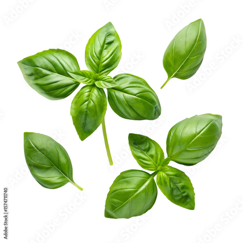 Set of healthy fresh basil herb leaves isolated on transparent background for culinary green design