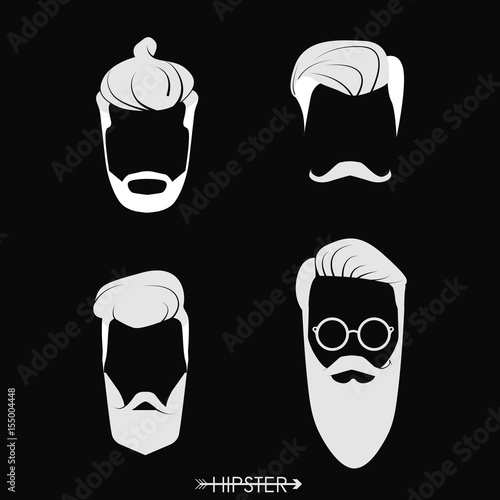 Set of hipster man haircuts, beards, mustaches. Simple design for logo, silhouette. Vector illustration.