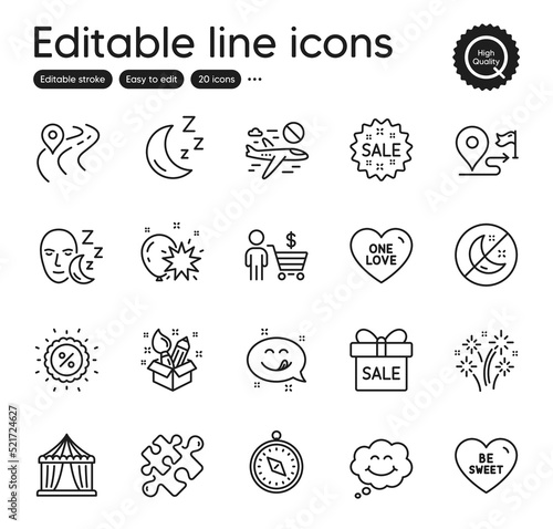 Set of Holidays outline icons. Contains icons as Fireworks, Buyer and Road elements. Sleep, Journey, Moon web signs. Discount, Puzzle, Sale offer elements. Be sweet, Balloon dart, One love. Vector