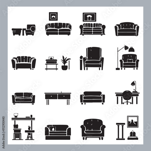 Set of house furniture silhouette Chair, sofa, table, bed, dresser, wardrobe, bookshelf, dining table, armchair, desk, cabinet vector in white background