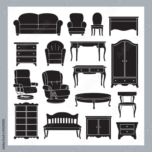 Set of house furniture silhouette Chair, sofa, table, bed, dresser, wardrobe, bookshelf, dining table, armchair, desk, cabinet vector in white background