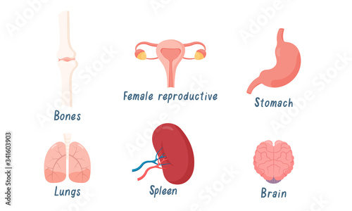 Set of human organs bones, lungs, brain, female reproductive system, spleen, stomach. Vector illustration in flat cartoon style.
