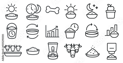 Set of icons for pet food and feeding bowls. The icons include a bowl of food, a bowl of water, a bowl of sand, a bowl of cat food, a bowl of dog food, a bowl of bird food