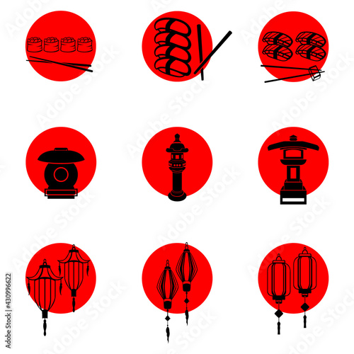 Set of icons in the Japanese style on the background of the sun. Japanese symbols sushi, lanterns and more.