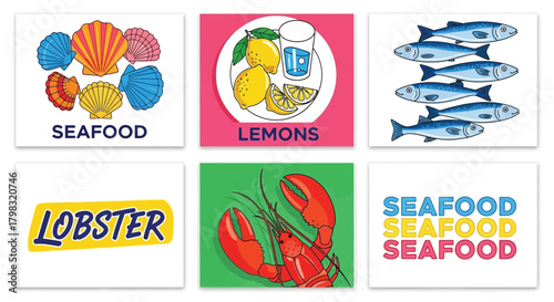 Set of Icons with Seafood, Lobster, Lemons, and Fish Illustrations