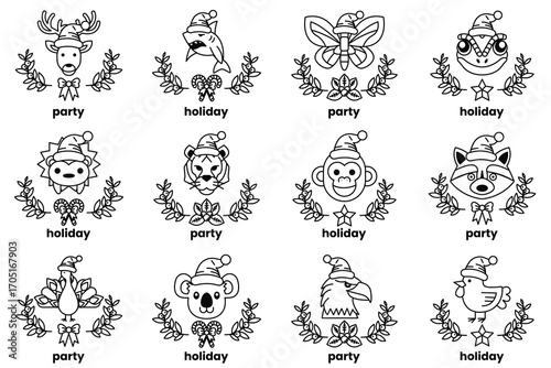 set of illustrations in the concept of Christmas animals and holidays in line art style