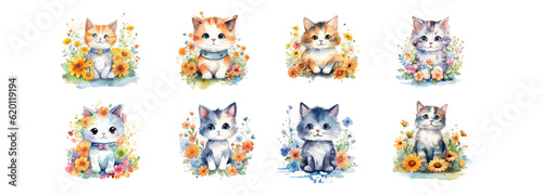 Set of illustrations of beautiful watercolor kittens for children and children's books AI