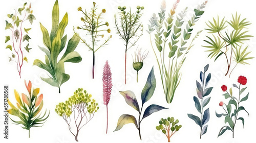 Set of illustrations of flowers, plants, pots, garden plants, decorative design elements, watercolor illustrations isolated on white background usable for design stickers wallpapers Generative AI