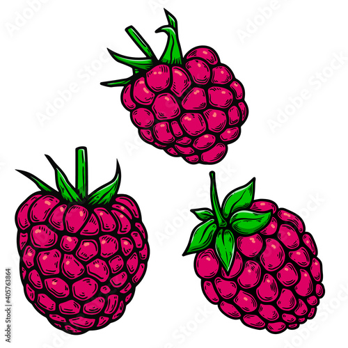 Set of Illustrations of raspberry in engraving style. Design element for poster, card, banner, sign. Vector illustration