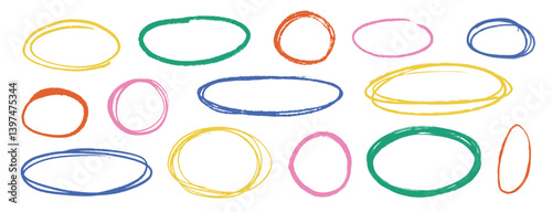 Set of ink doodle multicolor circle. Drawn scribble elements for notice in sketch style.