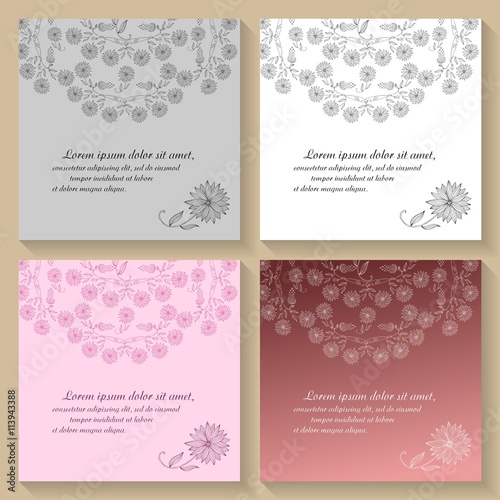 Set of invitation or greeting cards with beautiful floral ornament. Hand drawn vector illustration.