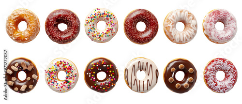 Set of isolated, variety of delicious donuts on transparent background. cut elements, designs. Top view high quality PNG." design elements, top view / flat lay.