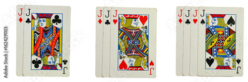 Set of jack playing cards in classic groupings, isolated on a transparent background.