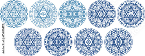 Set of Jewish motifs mandala. Highly detailed blue lace illustrations with folk floral motifs and six pointed star. Use as decoration for events and holidays