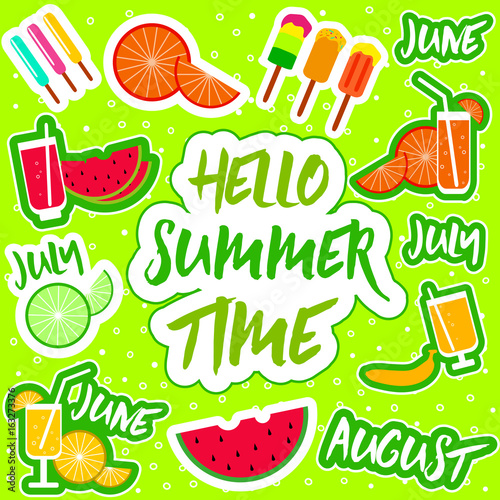 Set of juicy summer patches, stickers, badges. Cocktails, fruits, popsicles, "Hello summer time", "june", "july", "august" inscriptions. Vector illustration.