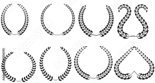 Set of Laurel wreath icon design isolated on white background. Laurel wreath award. Round border with wreath symbols, silhouette vector. Leaf border, laurel wreath design. Vector illustration.