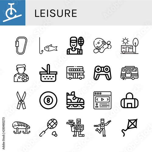 Set of leisure icons such as Rope biking, Carabiner, Fishing, Badminton, Pool kickboard, Camping, Footballer, Picnic basket, Touristic, Gamepad, Caravan, Shears, Billiard , leisure