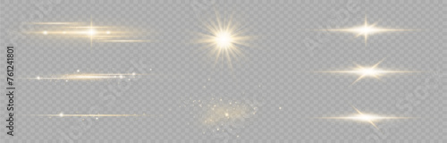 Set of light effects. Glare and flashes. Bright beams of light. Glowing lines. Dust. Christmas flash.Gold color vector illustration
