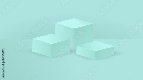 Set of light green square box pedestal podium. Cosmetic product display presentation. Minimal wall scene.
