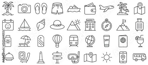 Set of line art icons of objects and symbols related to vacation holiday travel and tourism