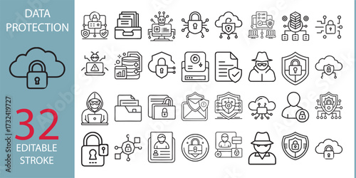 Set of line icons related to data protection, cyber security, privacy. Outline icon collection. Editable stroke. Vector illustration