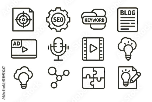 Set of linear seo and digital marketing icons with light bulb and microphone