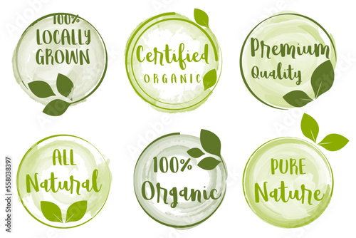 Set of logo, stickers and badges for organic food and drink, natural products, healthy life, food store and product promotion.