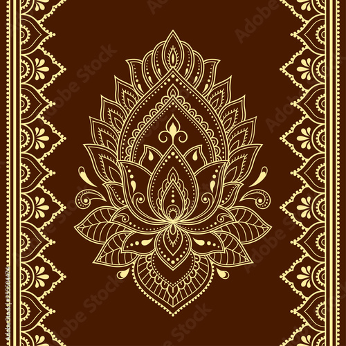 Set of lotus mehndi flower pattern and seamless border for Henna drawing and tattoo. Decoration in oriental, Indian style. Doodle ornament. Outline hand draw vector illustration.