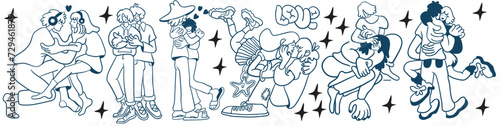 set of lovers on a date. couple hugging and kissing.people in lines doodle style.template for poster invitation sticker logo website design