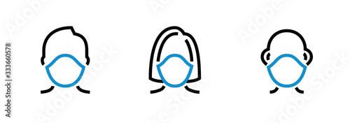 Set of Man, Woman, Kid in a respirator. Editable line vector.