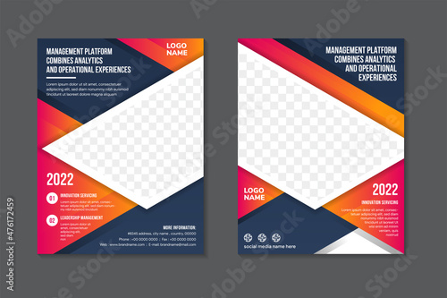 Set of management platform Flyer Template. modern vertical layout with diagonal photo collage. Combination yellow orange gradient and white on element and dark blue background.