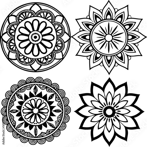 set of mandala black and white circular floral designs arranged on a white background in a square format