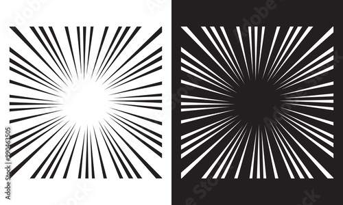 Set of manga or anime speed lines, zoom and motion effects. Comics radial light flash and fast movement icon. Isolated on white and black background. Vector illustration EPS 10
