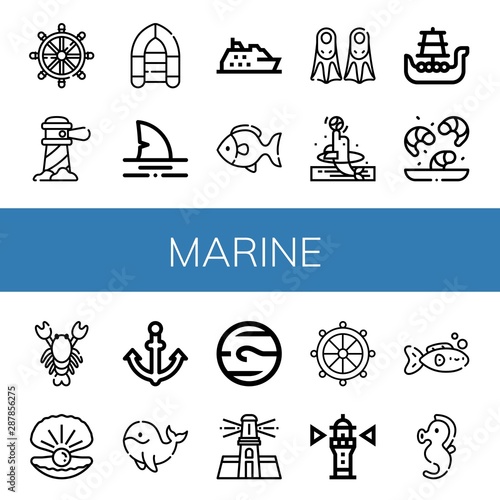 Set of marine icons such as Helm, Lighthouse, Inflatable boat, Shark, Cruise, Fish, Fins, Dolphin, Battleship, Shrimp, Lobster, Oyster, Anchor, Whale, Neptune, Seahorse , marine