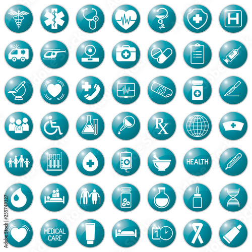 set of medical icons on circular blue colored buttons, vector, web design elements about medicine