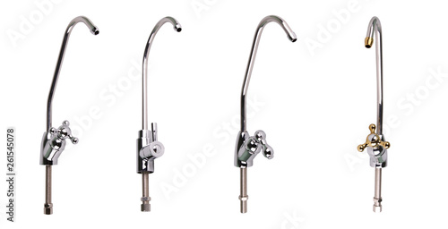 Set of metal 4 pcs. Tap for clean water. Isolated white background. Application for osmosis purification system, water supply from purification filters drinking. Installation for kitchen and bath.