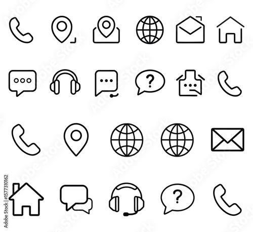 Set of Minimalist Line Icons for Communication, Location, Support, and Contact in Black and White Style