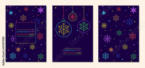 Set of modern and bright Christmas cards with snowflakes and snow. New Years invitation cards with balls. Ideal for printing on banners, clothing, textiles, wallpaper, gift wrapping, paper