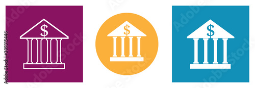 Set of modern bank icons in different colors. White line bank in yellow circle, red and blue square. Linear icon.