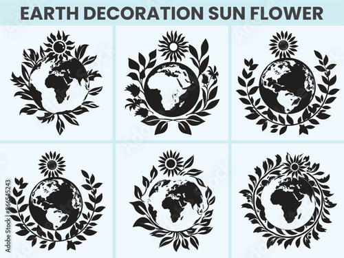Set of modern Flat Design Round Flower Decorations, Planet Earth World Globe Silhouette Icon on a White Background.