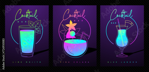 Set of modern fluorescent cocktail party posters with cocktails in different types of glasses. Cocktail menu design. Vector illustration
