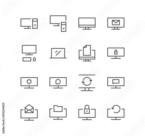 Set of monitor and technology icons, screen, business, laptop, computer, mail, refresh, folder and linear variety vectors.