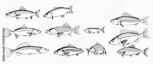 Set of monochrome hand-drawn fish illustrations including catfish, sturgeon, wolffish, carp, and more, drawing, mackerel