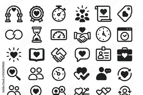 Set of monochrome love and relationship icons on dark background