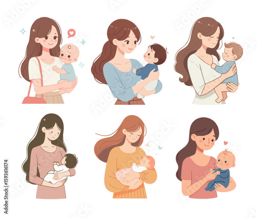 Set of Mother Cuddling Baby Style Flat Design Vector White Background